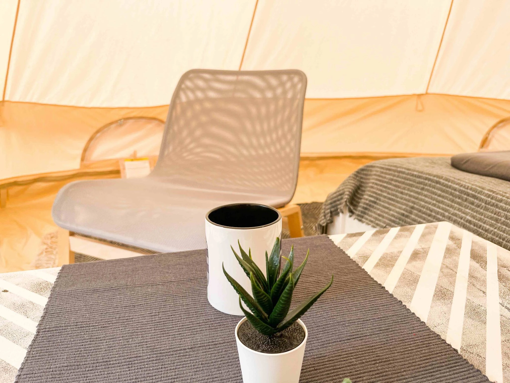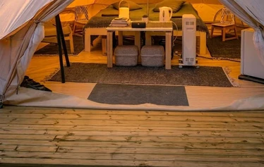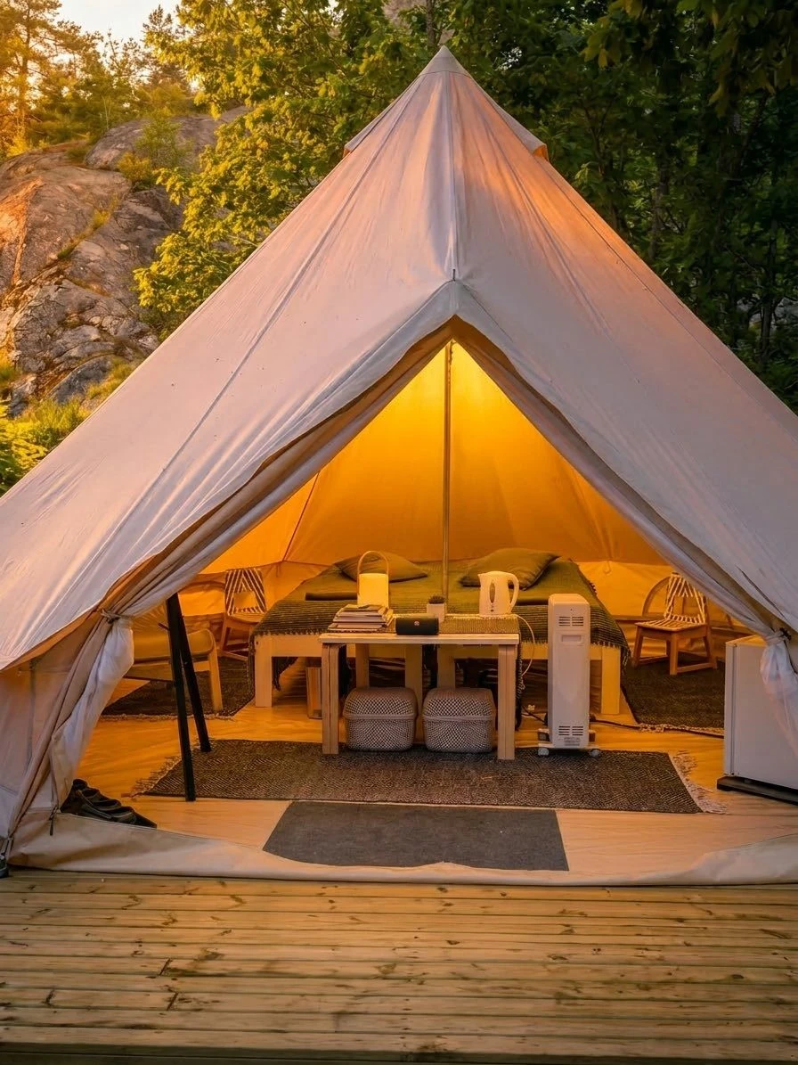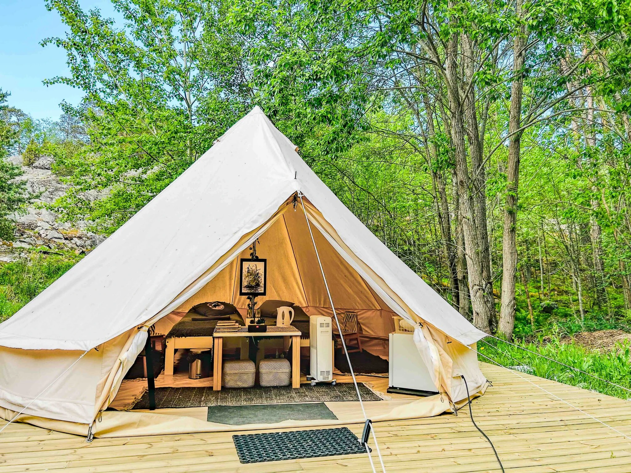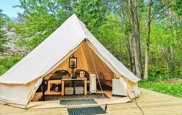 Are you interested in a camping trip in the middle of nature, but sleeping comfortably in bed under a blanket? We have opened a completely new accommodation option for the visitors of Kuninkaansaari island for the summer of 2023. The cozy tent of about 20 square meters is spacious and its room height is approx. three meters. The tent has heating, fridge, lighting, two beds, blankets, pillows and a carpet. There are sun loungers in the yard. The nearby rocks offer a wonderful view of the open sea and the surrounding nature.